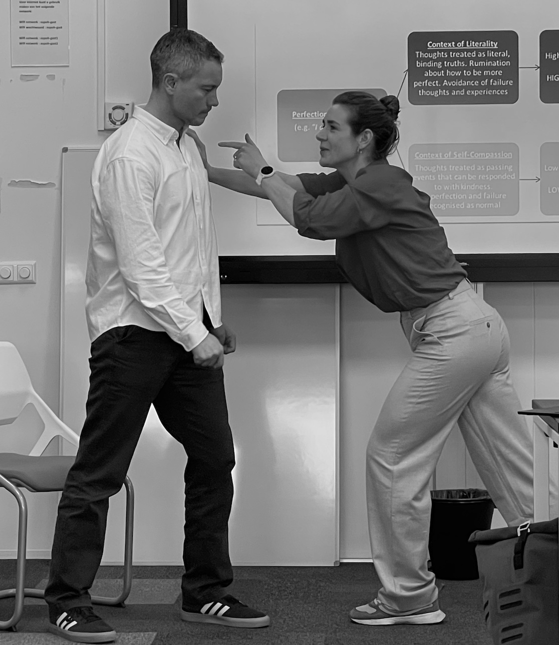 Wij zijn Ilja Saris en Arjan Schröder, twee ervaren psychiaters, die tijdens hun workshops en trainingen gebruik maken van kennis over evidence-based behandeltechnieken en deze dus buiten de psychiatrie brengen.